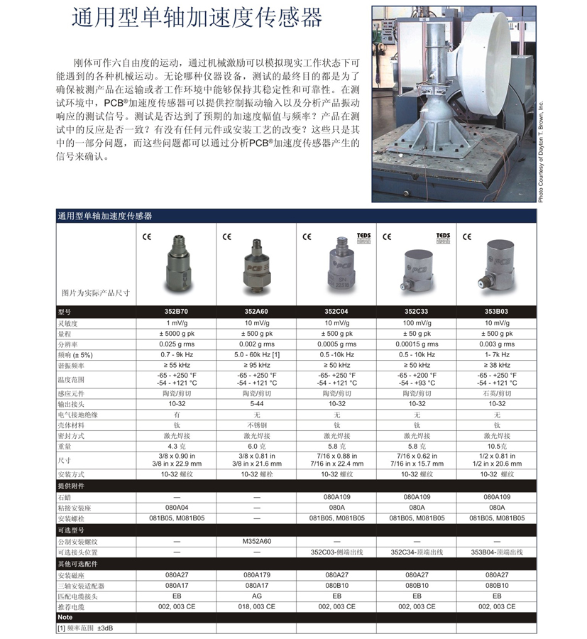 PCB Piezotronics制造精密型振動加速度計以滿足振動、沖擊、加速度測量和運動監(jiān)測、控制和測試應(yīng)用。PCB Piezotronincs提供ICP、PE、MEMS和電容傳感技術(shù)用于實現(xiàn)各種各樣的測量要求。PCB生產(chǎn)的加速度計有單軸、雙軸和三軸可選。這些產(chǎn)品用于工廠生產(chǎn)和設(shè)計人員以及研發(fā)組織的現(xiàn)場測試,從來獲取關(guān)鍵數(shù)據(jù)。除精密小型傳感器外,PCB的IMI部門還提供堅固的加速度計和振動傳感器用于工業(yè)機器振動監(jiān)控。由于不同的測試和工業(yè)環(huán)境有不同的安裝條件,所以PCB制造的加速度計具有各種不同的靈敏度、溫度、頻率響應(yīng)、振幅響應(yīng)、外形和引線的接地配置以滿足不同的需求。加速度計來評估設(shè)備或結(jié)構(gòu)性能的關(guān)鍵因素,因此,這樣的應(yīng)用通常需要整個測量系統(tǒng)的校準(zhǔn)證明,從傳感器到*終的輸出。美國PCB加速度傳感器352C04的每個傳感器出貨時都隨貨附帶一個可溯源到NIST的校準(zhǔn)證書。