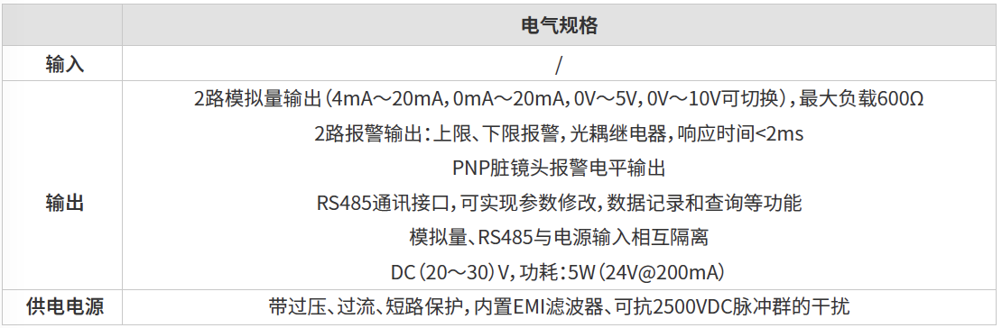豐富的外設(shè)接口:獨(dú)立的模擬量輸出、報警輸出、電平輸出、RS485通訊接口