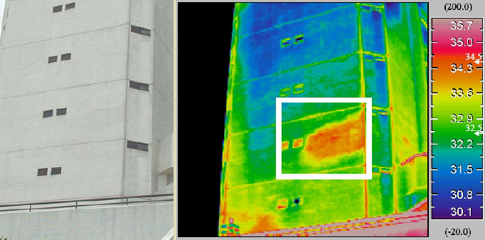建(構)筑物墻面、屋面及各種管道在使用過程中因各種因素導致的開裂、斷裂而造成滲漏等缺陷均可用紅外熱像儀進行檢測,而且方便、快速、可大面積檢測,而有時人工目測卻找不出問題所在。如果建筑物表面深層相對于周圍的材料表現出熱或涼,則其表面的溫度也相應地表現出熱或涼,借助紅外熱像儀可探測出這一深層熱或涼的位置。如地下管道隔熱層斷裂,那么,在表面將會產生熱點,用熱像儀可直接測得;管道熱水泄漏浸透周圍區域,使區域導熱性增加,從而使周圍溫度比無泄漏干燥區溫度高,據此可探測泄漏部位,可以避免不必要的開挖過程,節省費用。
