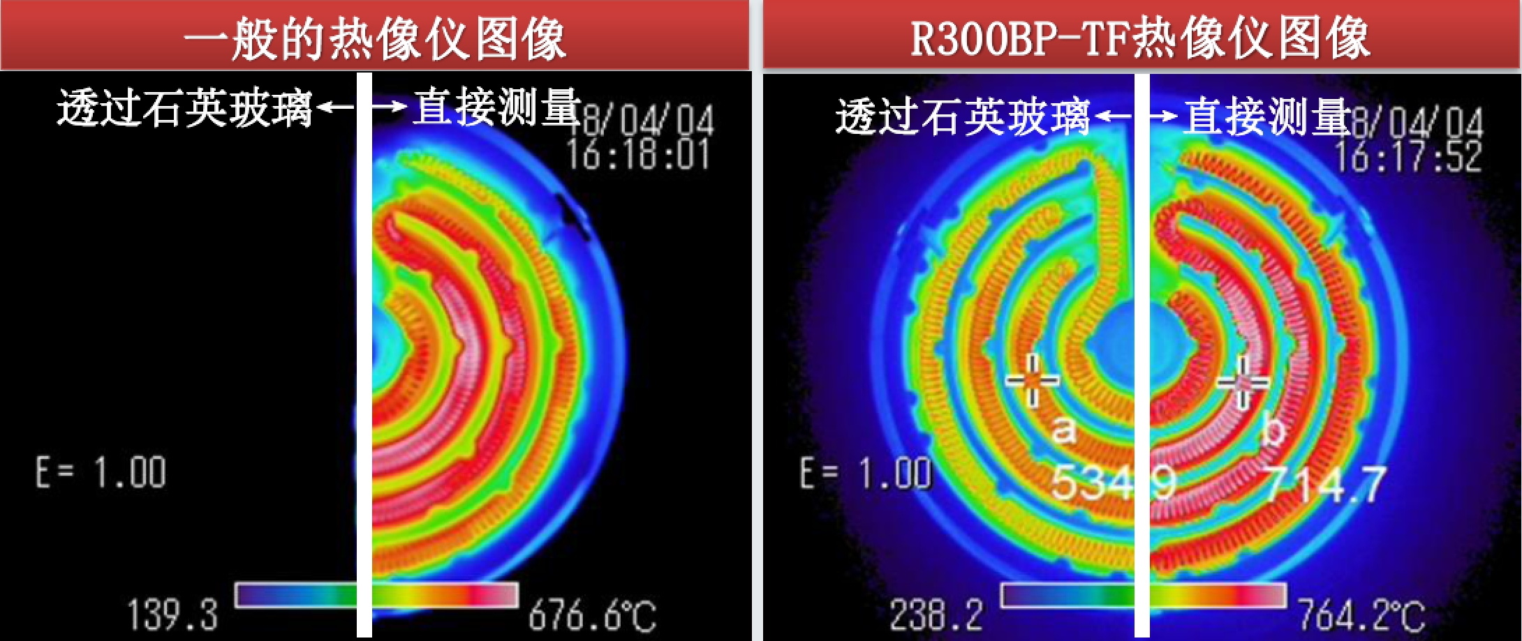 應(yīng)用:需要測(cè)量運(yùn)行中的爐內(nèi)溫度,但是規(guī)定不能打開(kāi)觀察窗口石英玻璃。使用透過(guò)測(cè)量的熱像儀時(shí),只能捕捉到火焰溫度